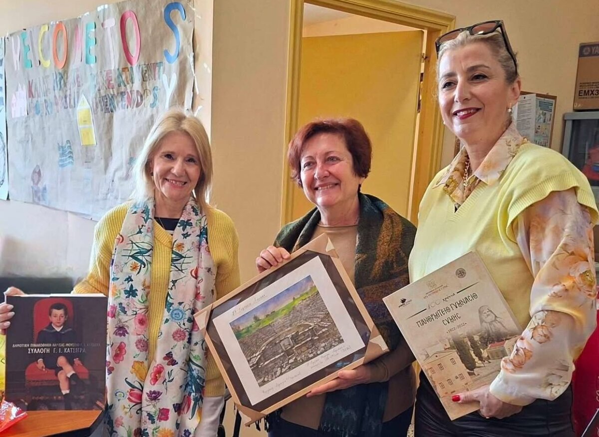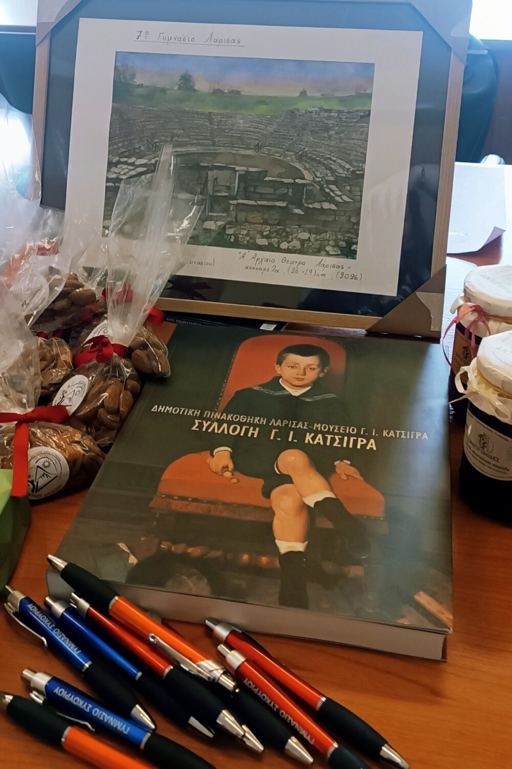 Κατά την επίσκεψη στο Γυμνάσιο Σύμης, πραγματοποιήθηκε μια όμορφη ανταλλαγή δώρων, που ενίσχυσε ακόμη περισσότερο το πνεύμα συνεργασίας και επικοινωνίας μεταξύ ενός σχολείου αστικής περιοχής με ένα αντίστοιχο ακριτικό και ιδιαίτερα ενδιαφέρον σχολείο. Προσφέρθηκε από το 7ο Γυμνάσιο ένας αξιόλογος τόμος με έργα της Δημοτικής Πινακοθήκης Λάρισας, «Η Συλλογή Γ.Ι. Κατσίγρα», ευγενική προσφορά του Δημάρχου Λαρισαίων κ. Αθανασίου Μαμάκου και του Αντιδημάρχου Παιδείας κ. Χρήστου Αγορίτσα. Θερμές ευχαριστίες για τη σημαντική αυτή συμβολή.