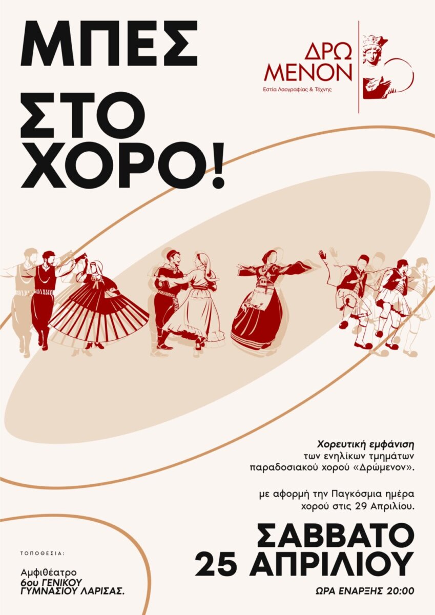 Η Εστία Λαογραφίας & Τέχνης «Δρώμενον» διοργανώνει το Σάββατο 25 Απριλίου 2026 και ώρα 20.00, στο Αμφιθέατρο του 6ου Γενικού Λυκείου Λάρισας μια ξεχωριστή χορευτική εκδήλωση με τίτλο «Μπες στο χορό!», αφιερωμένη στην Παγκόσμια Ημέρα Χορού, η οποία τιμάται κάθε χρόνο στις 29 Απριλίου.