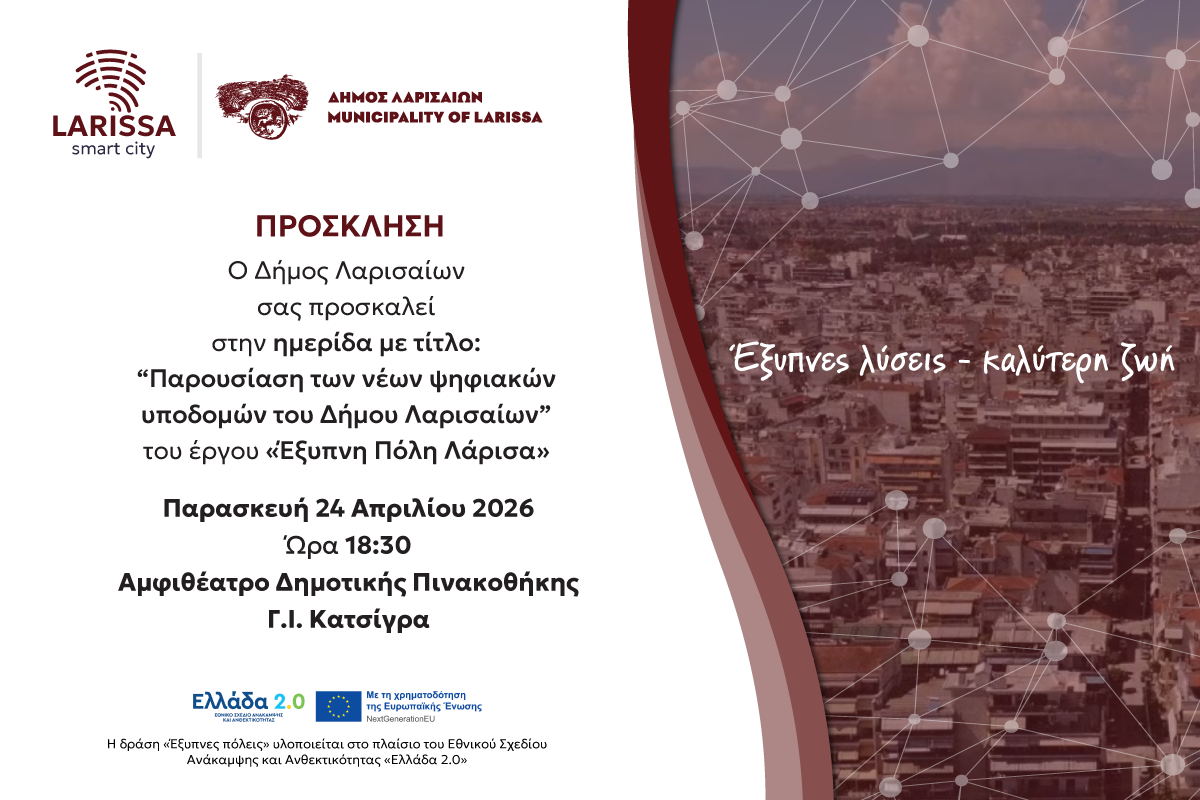 Να σημειωθεί ότι οι ψηφιακές εφαρμογές που θα παρουσιαστούν δημιουργήθηκαν στο πλαίσιο του έργου «Έξυπνη Πόλη Λάρισα». Βελτιώνουν την εξυπηρέτηση του πολίτη, ενισχύουν την ασφάλεια, αναβαθμίζουν τη λειτουργία των υπηρεσιών του Δήμου και συμβάλλουν σε ένα περιβάλλον πιο σύγχρονο, πιο ποιοτικό, πιο αποτελεσματικό και πιο διαφανές, στοχεύοντας σε κρίσιμους τομείς της ζωής της πόλης: την κινητικότητα, τη διαβίωση, την εξυπηρέτηση του πολίτη, την εκπαίδευση, το περιβάλλον, τη διακυβέρνηση και, φυσικά, τη συμμετοχή του πολίτη στη λήψη αποφάσεων.