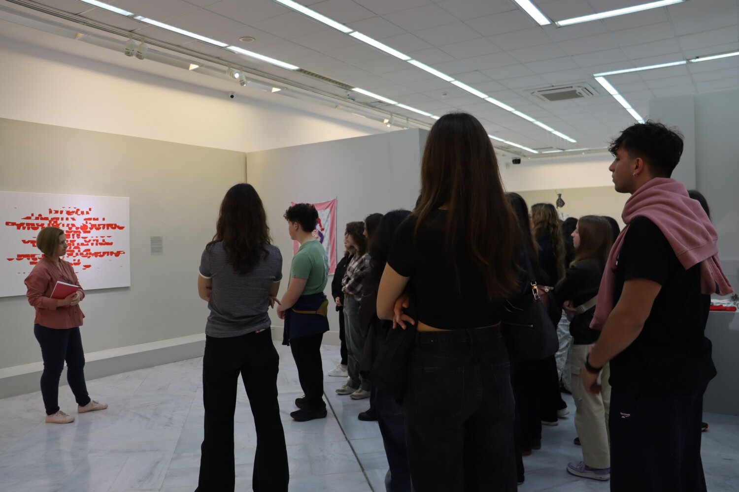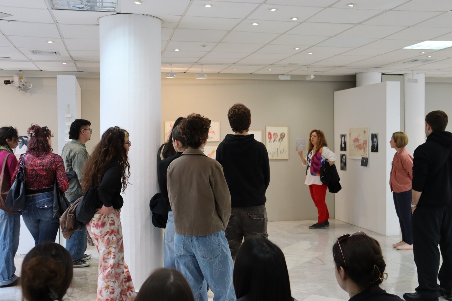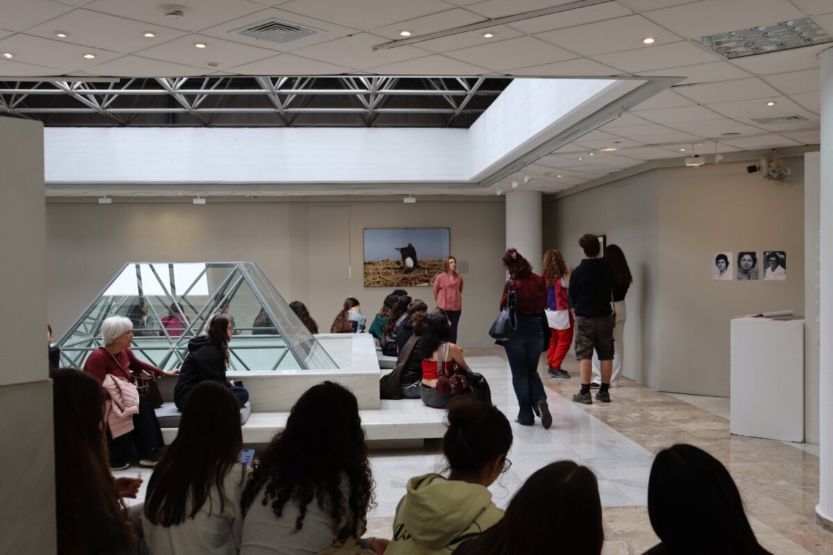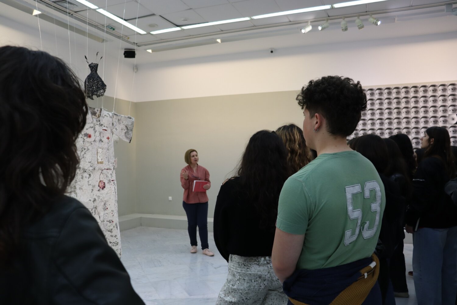 Τους συνόδευσαν ο κ. Μπομπός και η κα. Χατζηνικολάου, η οποία συμμετέχει με έργο της στην έκθεση “Women’s matters – Γυναικεία Ζητήματα” και συνομίλησε με τους φοιτητές για τη θεματική, τις καλλιτεχνικές προσεγγίσεις και τον ρόλο της τέχνης στη σύγχρονη κοινωνία.