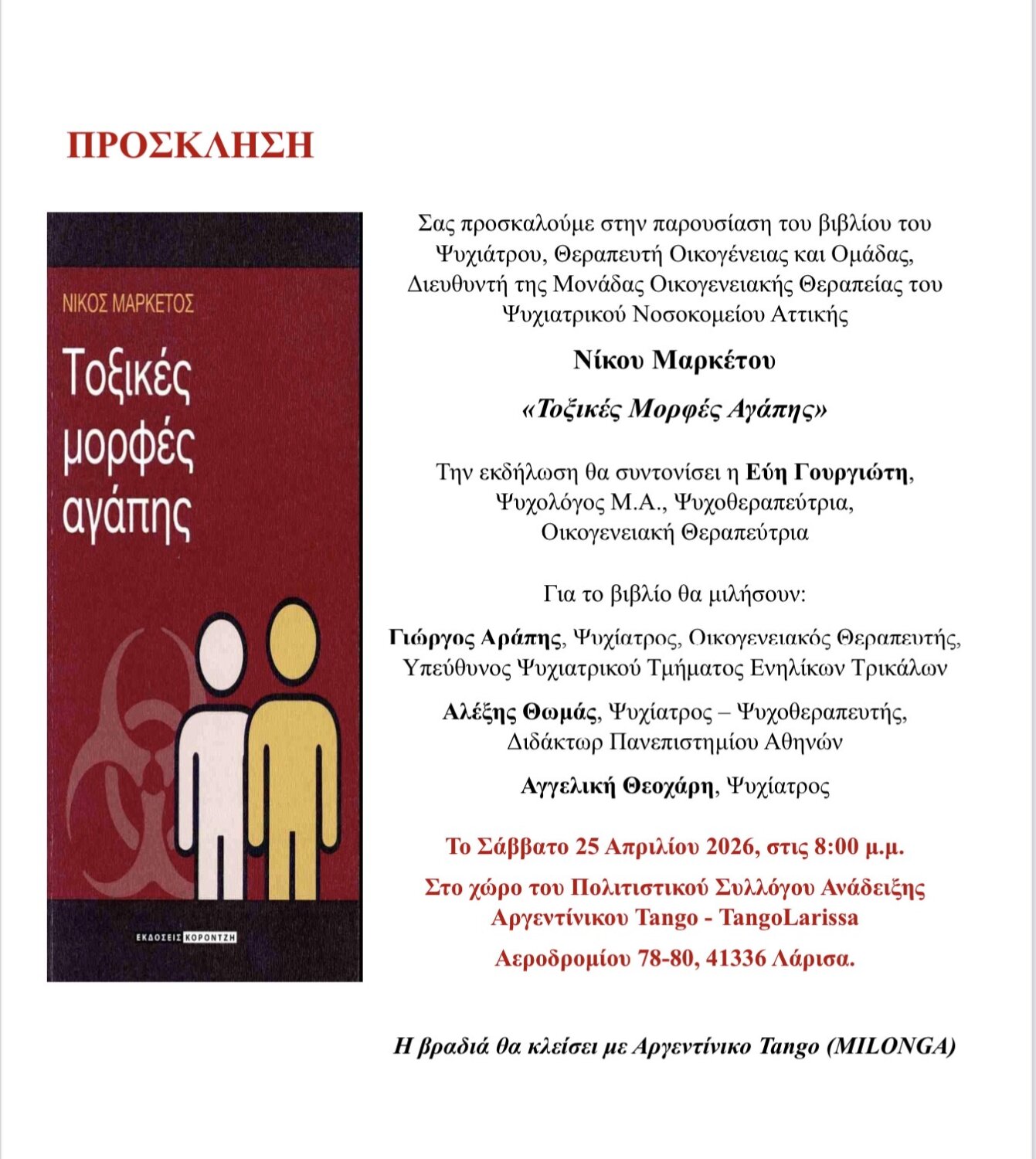 Το βιβλίο «Τοξικές Μορφές Αγάπης» του Νίκου Μαρκέτου θα παρουσιαστεί το Σάββατο 25 Απριλίου 2026, στις 8:00 μ.μ., στο χώρο του Πολιτιστικού Συλλόγου Ανάδειξης Αργεντίνικου Tango – TangoLarissa, Αεροδρομίου 78-80 στην Λάρισα.