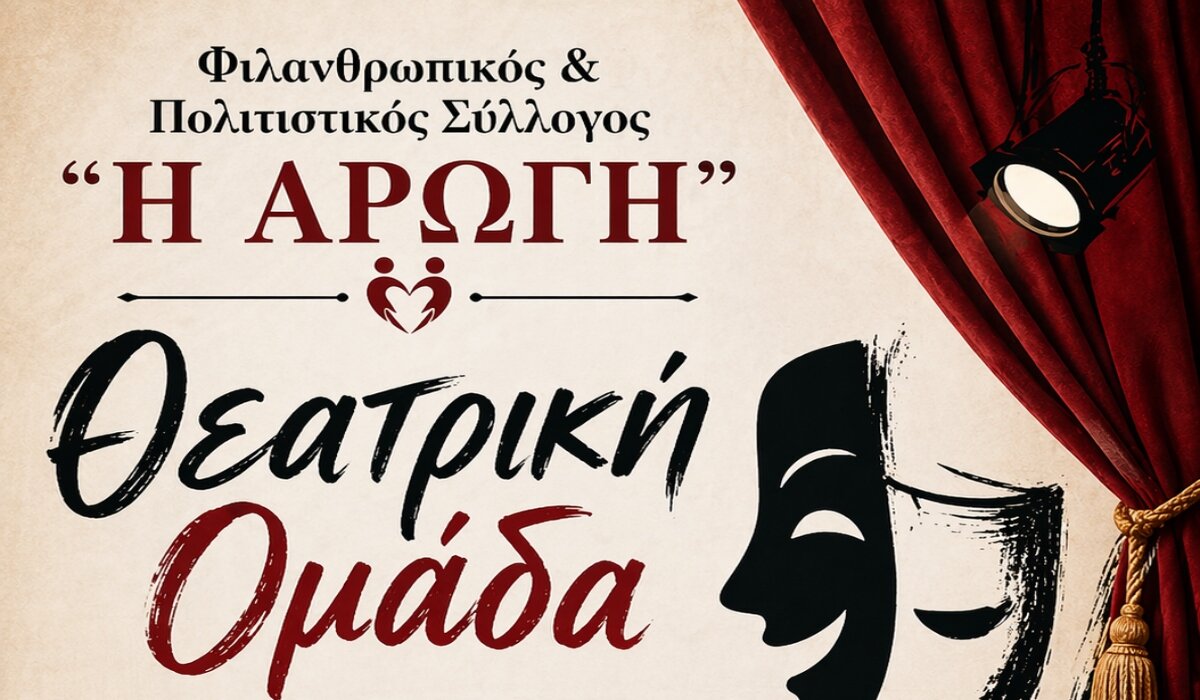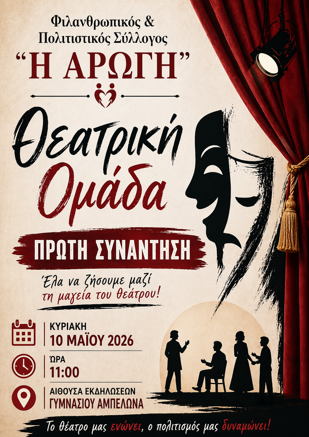 Ο Φιλανθρωπικός και Πολιτιστικός Σύλλογος «Η Αρωγή» Αμπελώνα ανακοινώνει ότι ένας ικανοποιητικός αριθμός ατόμων έχει εκδηλώσει το ενδιαφέρον τους για να συμμετάσχουν στην δημιουργία θεατρικής ομάδας, που μας δίνει την δυνατότητα να ξεκινήσουμε και να αποκτήσει ο Αμπελώνας την δική του Θεατρική Ομάδα.