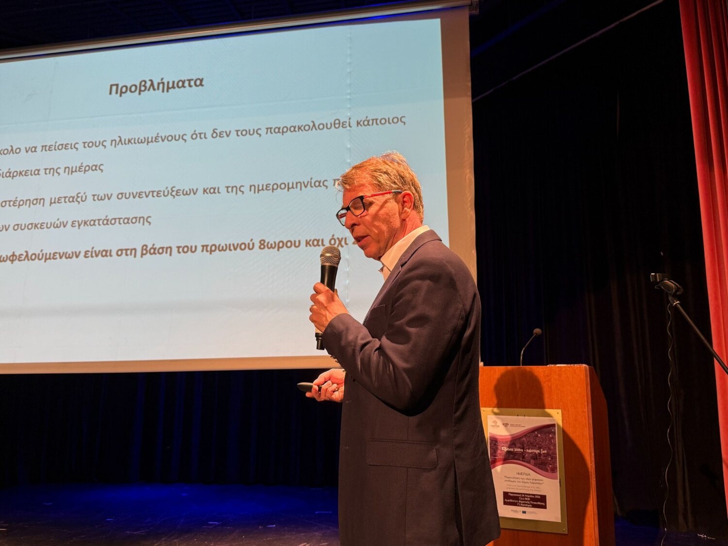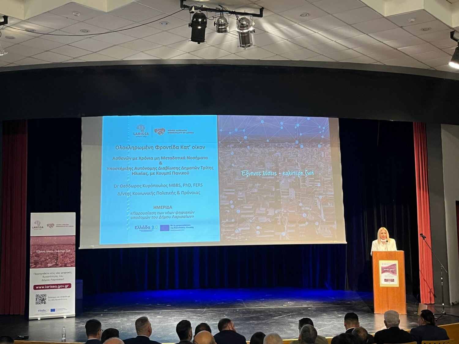 Στη συνέχεια ο Δρ. Θεόδωρος Κυρόπουλος, Αν. Προϊστάμενος Δ/νσης Κοινωνικής Πολιτικής & Πρόνοιας, στάθηκε ιδιαίτερα στις υποδράσεις του προγράμματος για Φροντίδα Ασθενών στο σπίτι και Αυτόνομης Διαβίωσης της τρίτης ηλικίας (με κουμπί πανικού).