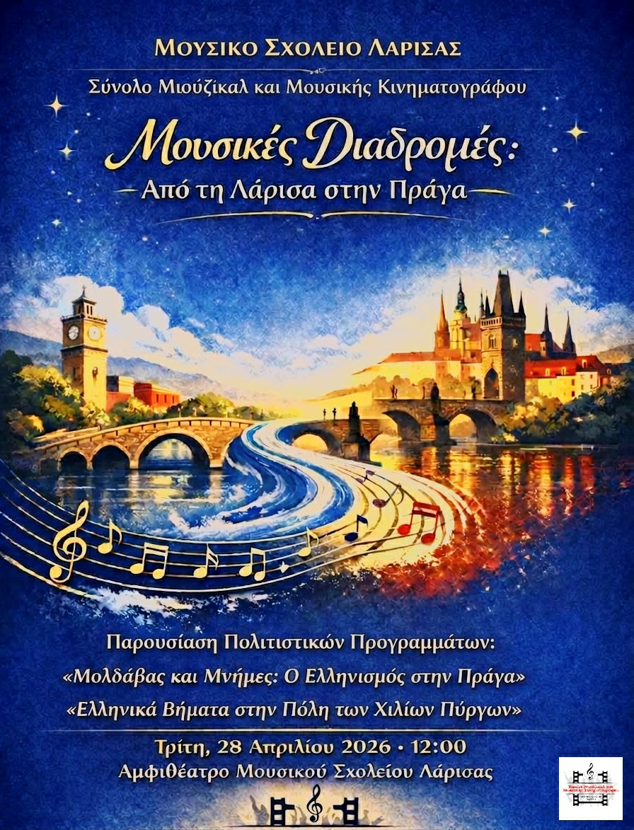 Το Μουσικό Σχολείο Λάρισας και το σύνολο «Μιούζικαλ και Μουσικής Κινηματογράφου» σας προσκαλούν σε μια ξεχωριστή μουσική παράσταση την Τρίτη 28 Απριλίου 2026, στις 12:00, στο Αμφιθέατρο του Μουσικού Σχολείου. Η εκδήλωση συνιστά την κορύφωση δύο Προγραμμάτων Σχολικών Δραστηριοτήτων (Πολιτιστικών Θεμάτων) που υλοποιούνται κατά το τρέχον σχολικό έτος: «Ελληνικά Βήματα στην Πόλη των Χιλίων Πύργων» & «Μολδάβας και Μνήμες: Ο Ελληνισμός στην Πράγα»