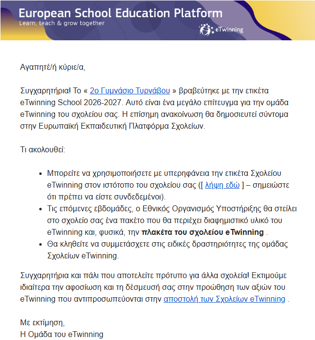 «Με ιδιαίτερη χαρά και υπερηφάνεια ανακοινώνουμε ότι το 2ο Γυμνάσιο Τυρνάβου τιμήθηκε με την Ετικέτα Σχολείου eTwinning για την περίοδο 2026-2027, μια σημαντική ευρωπαϊκή αναγνώριση που απονέμεται σε σχολικές μονάδες οι οποίες διακρίνονται για τη συστηματική και ποιοτική συμμετοχή τους σε εκπαιδευτικά προγράμματα eTwinning.