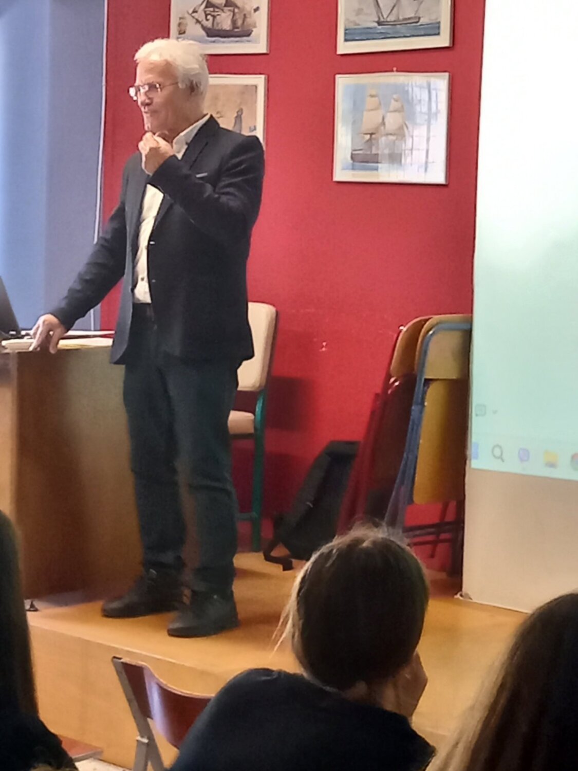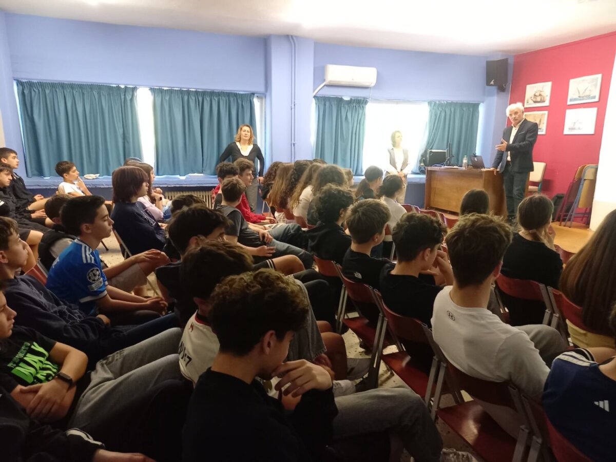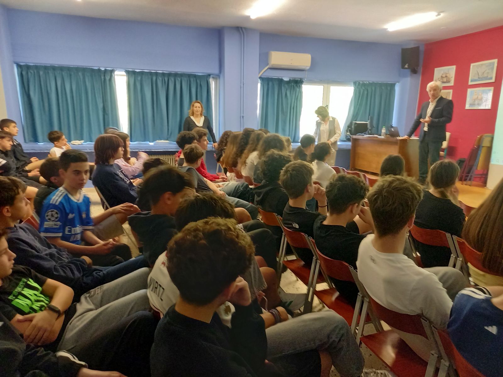 Στη συνέχεια, ο Πρόεδρος του Ε.Κ.Ε.ΤΕ. και Σύμβουλος Εκπαίδευσης Μαθηματικών, κ. Κωνσταντίνος Μπουραζάνας, ανέπτυξε στους μαθητές την αναγκαιότητα των μαθηματικών στην καθημερινή ζωή. Με άμεσα και κατανοητά παραδείγματα, εξήγησε πώς η μαθηματική σκέψη βρίσκεται παντού: από τις αναλογίες που χρησιμοποιούμε στην κουζίνα μας για την παρασκευή ενός φαγητού, μέχρι τους σύνθετους αλγορίθμους της Τεχνητής Νοημοσύνης που διαμορφώνουν τις προτιμήσεις μας στις αναρτήσεις του κινητού μας. Παράλληλα, έδωσε ιδιαίτερη έμφαση στην καλλιέργεια της κριτικής σκέψης ως απαραίτητο εφόδιο για το μέλλον τους.