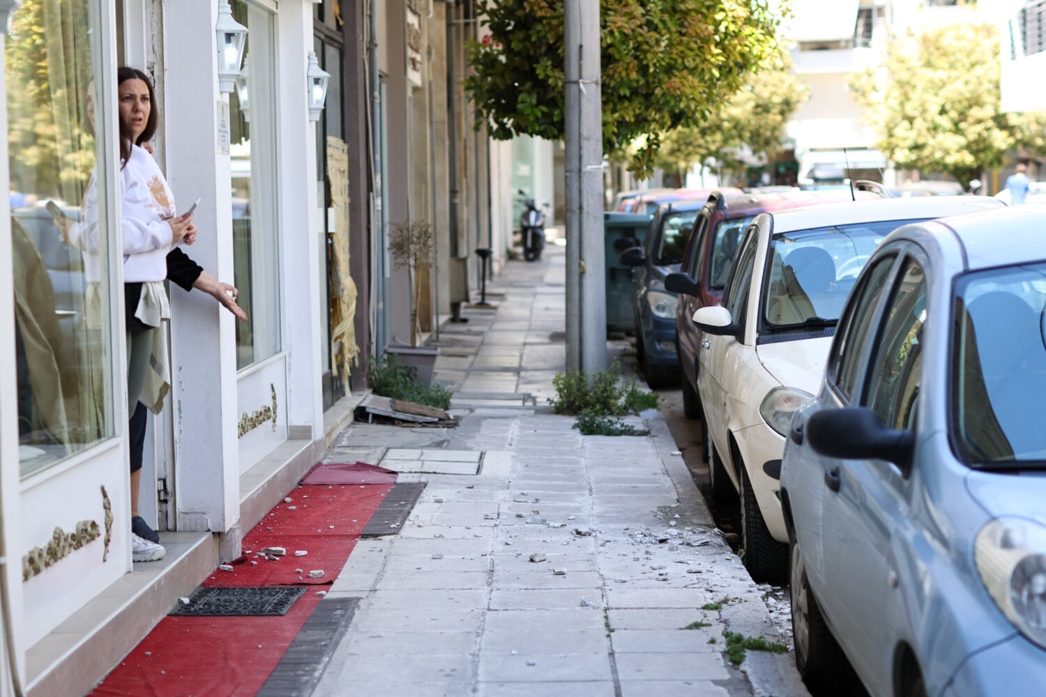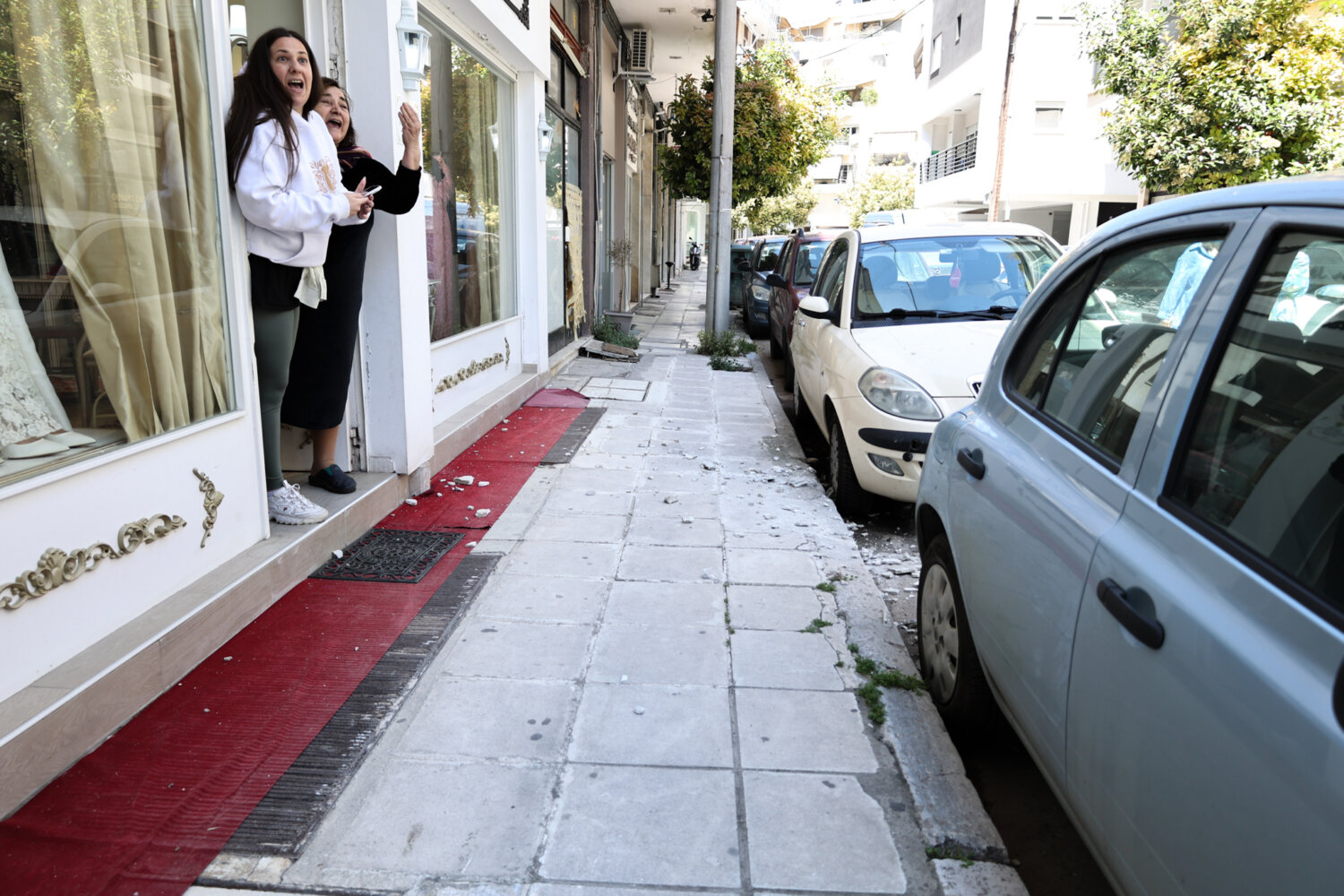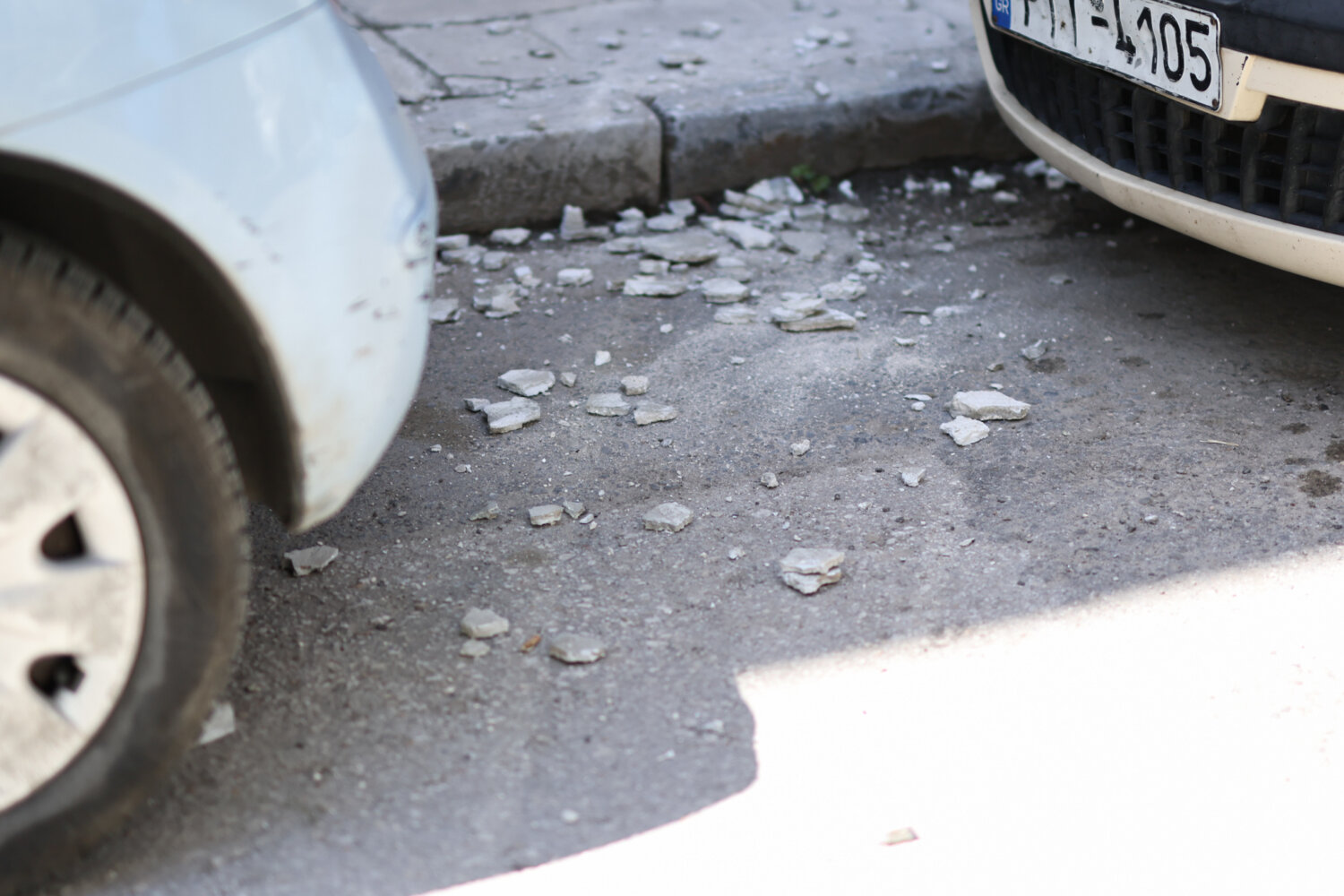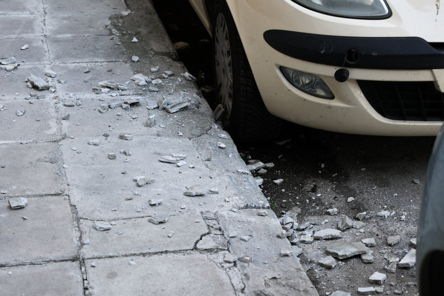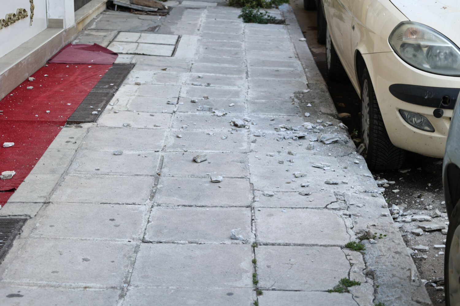 Οι σοβάδες έπεσαν στο πεζοδρόμιο, ενώ από τύχη αποφεύχθηκαν τα χειρότερα καθώς το σημείο είναι πολυσύχναστο με παρακείμενα καταστήματα να βρίσκονται σε λειτουργία.