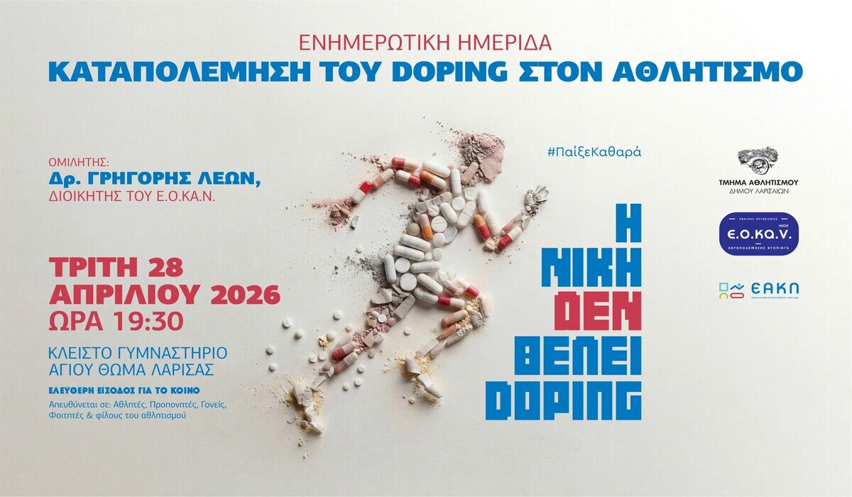 Ο Δήμος Λαρισαίων – Τμήμα Αθλητισμού, σε συνεργασία με τον Εθνικό Οργανισμό Καταπολέμησης Ντόπινγκ (Ε.Ο.ΚΑ.Ν.), διοργανώνουν ενημερωτική ημερίδα με θέμα την καταπολέμηση του ντόπινγκ στον αθλητισμό, με τίτλο «Η Νίκη δεν θέλει Doping».