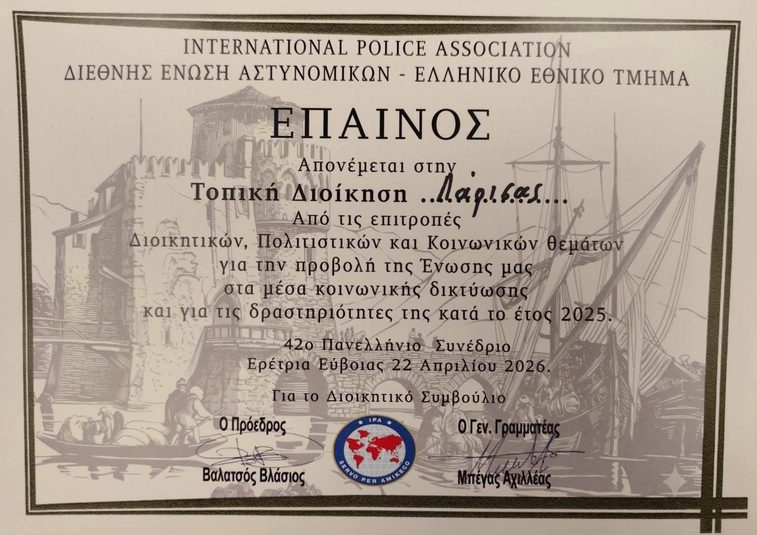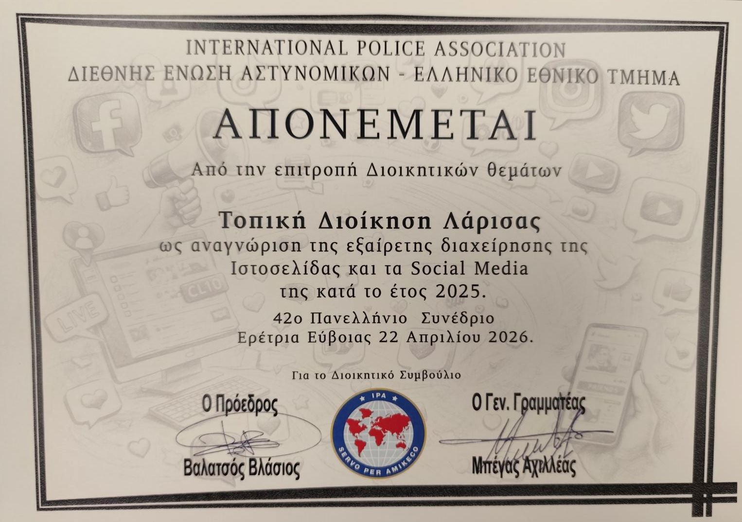 Το χρονικό διάστημα 20-24 Απριλίου 2026, διεξήχθη στην πανέμορφη κωμόπολη της Ερέτριας, το 42ο Πανελλήνιο Συνέδριο της Διεθνούς Ένωσης Αστυνομικών. Το συνέδριο παρακολούθησαν αντιπρόσωποι των Τοπικών Διοικήσεων από όλη την Ελλάδα, καθώς και εκπρόσωποι ξένων Εθνικών Τμημάτων και συγκεκριμένα του Κυπριακού και του Γερμανικού. Από την Τ.Δ. Λάρισας συμμετείχαν ο Πρόεδρος κ. Καλαμπούκας Αχιλλέας, ο Α΄ Αντιπρόεδρος κ. Ζάχος Σωτήριος, ο Αν. Ταμίας κ. Ζουρλαδάνης Δημήτριος, και η Πρόεδρος της Εξελεγκτικής Επιτροπής κα. Πασχαλάκη Μαρία.