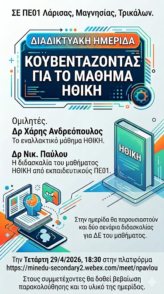 Διαδικτυακή ημερίδα με θέμα το νέο, εναλλακτικό σε σχέση με τα Θρησκευτικά, μάθημα της «Ηθικής» διοργανώνει ο Σύμβουλος Εκπαίδευσης κλ. ΠΕ01 Θεολόγων Λάρισας, Μαγνησίας και Τρικάλων Δρ. Νίκος Παύλου, σήμερα Τετάρτη (29-04-2026) στις 6.30 μ.μ.
