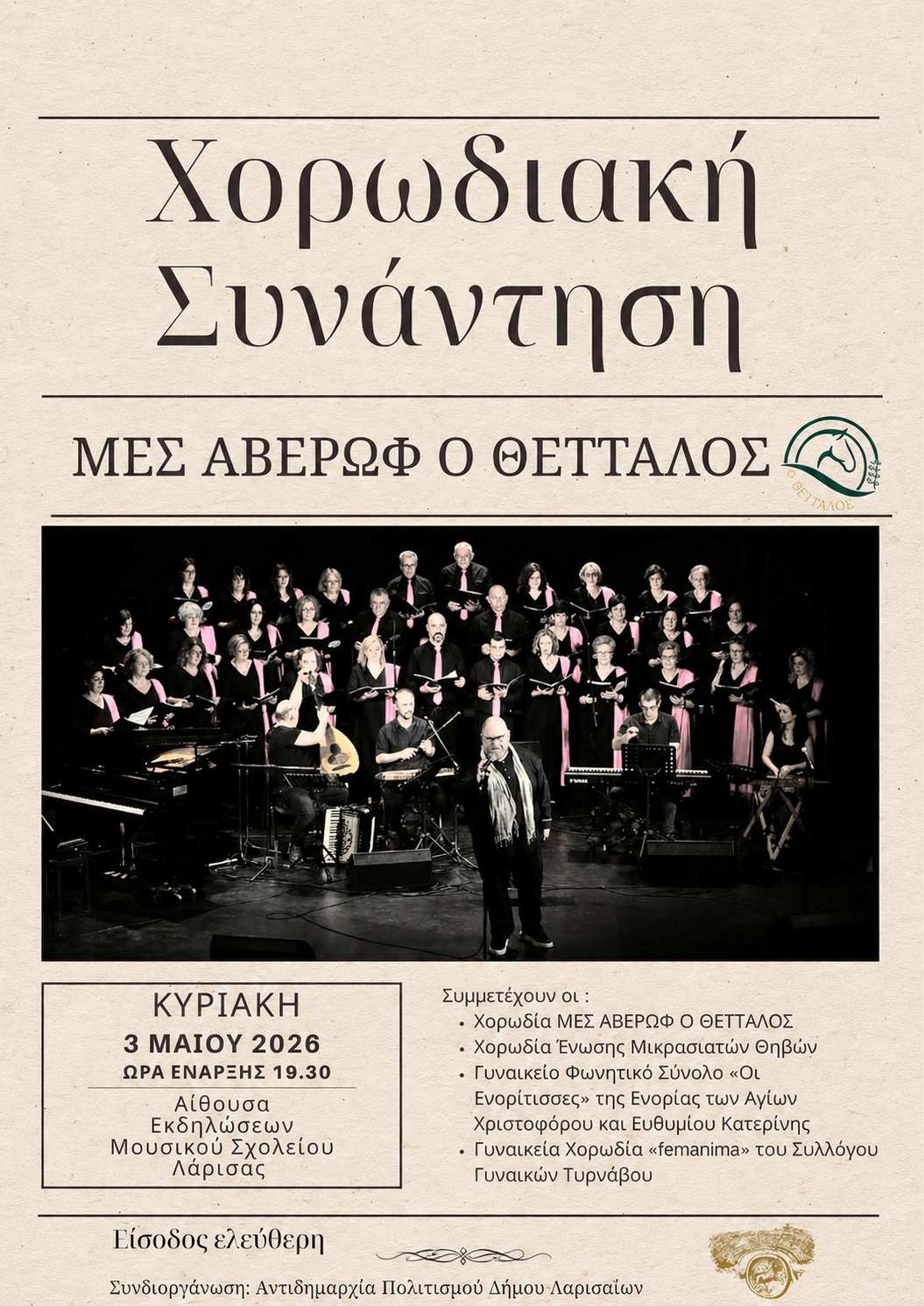 Η καρδιά της παραδοσιακής μουσικής και της χορωδιακής τέχνης ετοιμάζεται να χτυπήσει δυνατά στην πόλη μας. Ο Μ.Ε.Σ. Αβέρωφ «ο ΘΕΤΤΑΛΟΣ» διοργανώνει μια μεγάλη Χορωδιακή Συνάντηση την Κυριακή 3 Μαΐου 2026 και ώρα 19:30, στην Αίθουσα Εκδηλώσεων του Μουσικού Σχολείου Λάρισας. Η εκδήλωση πραγματοποιείται σε συνεργασία με την Αντιδημαρχία Πολιτισμού του Δήμου Λαρισαίων, ενώ την καλλιτεχνική επιμέλεια υπογράφει ο καθηγητής παραδοσιακής και βυζαντινής μουσικής, Γεώργιος Τερζούδης.
