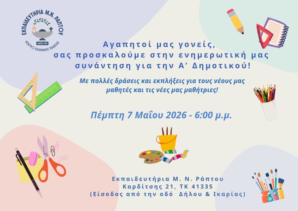 Στα Εκπαιδευτήρια Μ. Ν. Ράπτου, την Πέμπτη 7 Μαΐου 2026 και ώρα 18:00, «προσκαλούμε τους μαθητές και τις μαθήτριες που προετοιμάζονται για τη φοίτησή τους στην Α’ Δημοτικού του Σχολείου μας από τον ερχόμενο Σεπτέμβρη.