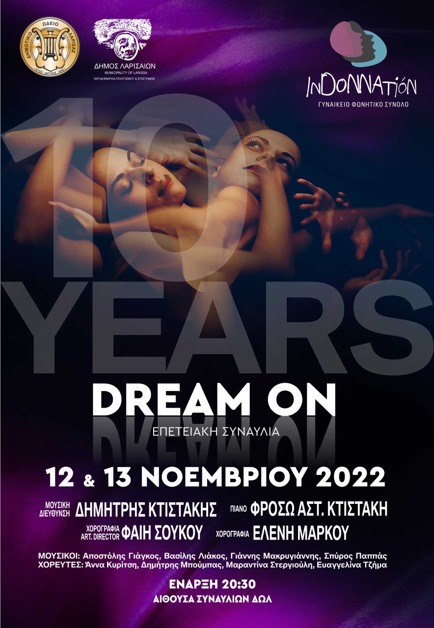 Το γυναικείο φωνητικό σύνολο «InDonnatión» του Δημοτικού Ωδείου Λάρισας, υπό την αιγίδα της Αντιδημαρχίας Πολιτισμού και Επιστημών, παρουσιάζει την επετειακή της συναυλία σε διεύθυνση του μαέστρου Δημήτρη Κτιστάκη, στην αίθουσα συναυλιών του Δημοτικού Ωδείου Λάρισας στις 12 και 13 Νοέμβρη 2022, στις 20:30.
