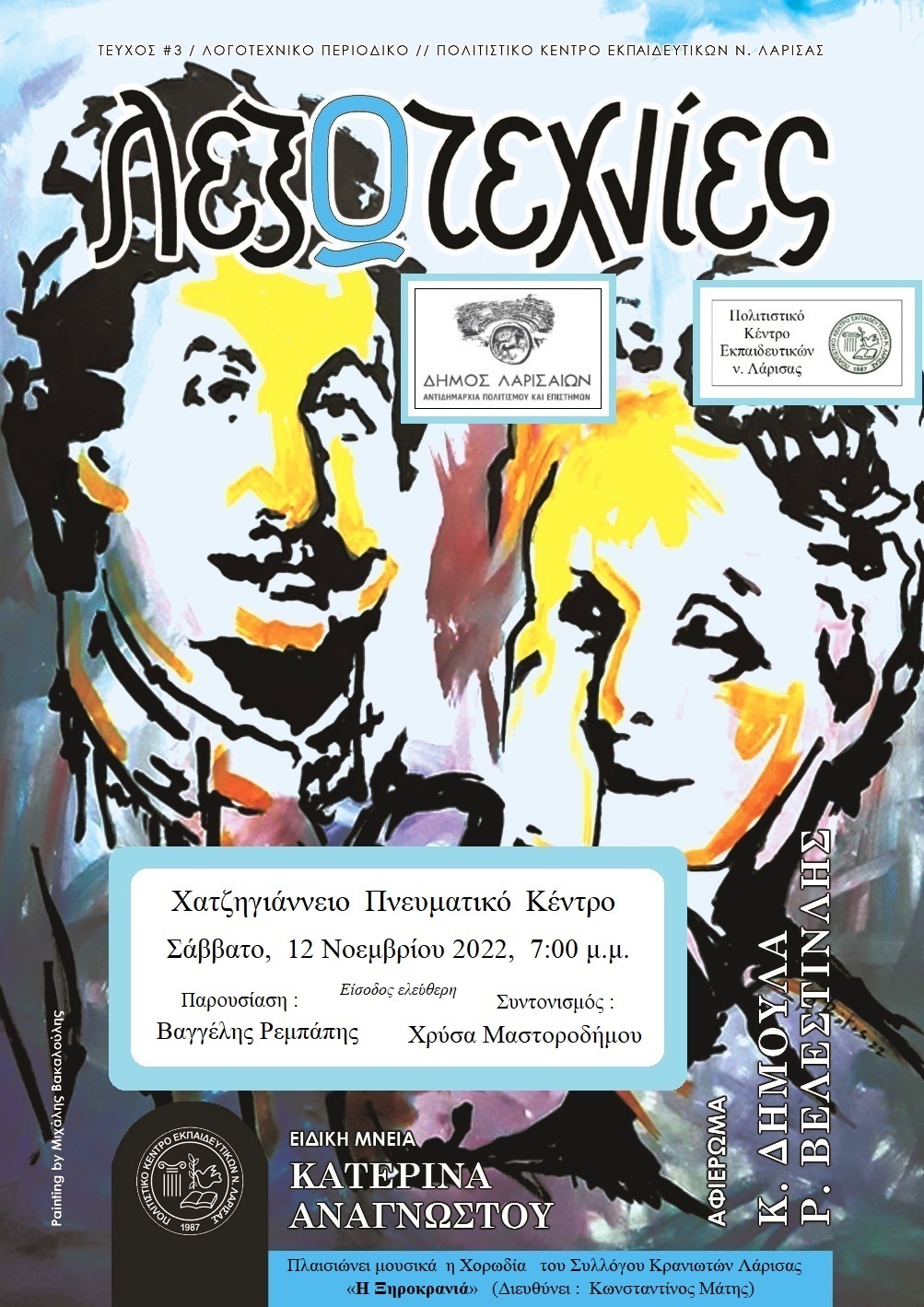 Το 3ο τεύχος του ετήσιου λογοτεχνικού περιοδικού «ΛεξΩτεχνίες» του ΠΟΚΕΛ παρουσιάζεται για το κοινό της Λάρισας, από το Πολιτιστικό Κέντρο Εκπαιδευτικών νομού Λάρισας, σε συνεργασία με την Αντιδημαρχία Πολιτισμού και Επιστημών του Δήμου Λαρισαίων, το Σάββατο 12 Νοεμβρίου 2022, στις 7:00 μ.μ. στο Χατζηγιάννειο Πνευματικό Κέντρο, με ελεύθερη είσοδο.