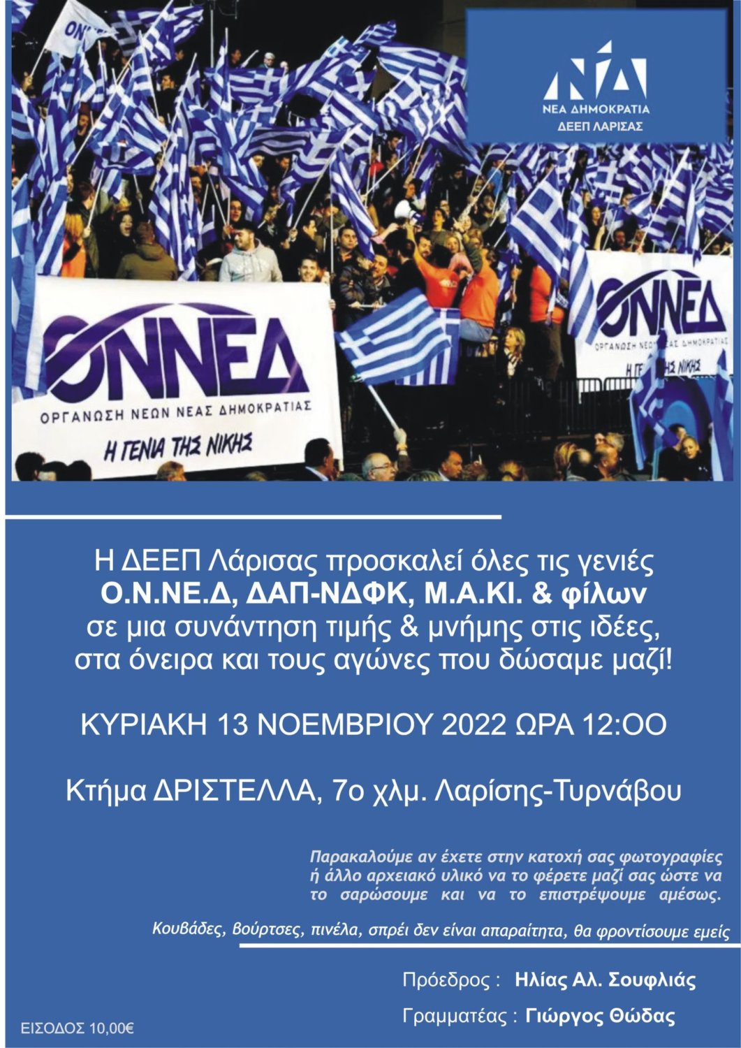 Η Δ.Ε.Ε.Π. Λάρισας διοργανώνει συνάντηση τιμής και μνήμης στις ιδέες, στα όνειρα και στους αγώνες και προσκαλεί όλες τις γενιές των ΟΝΝΕΔιτών την Κυριακή 13 Νοεμβρίου στις 12 στο κτήμα Δρυστέλλα.