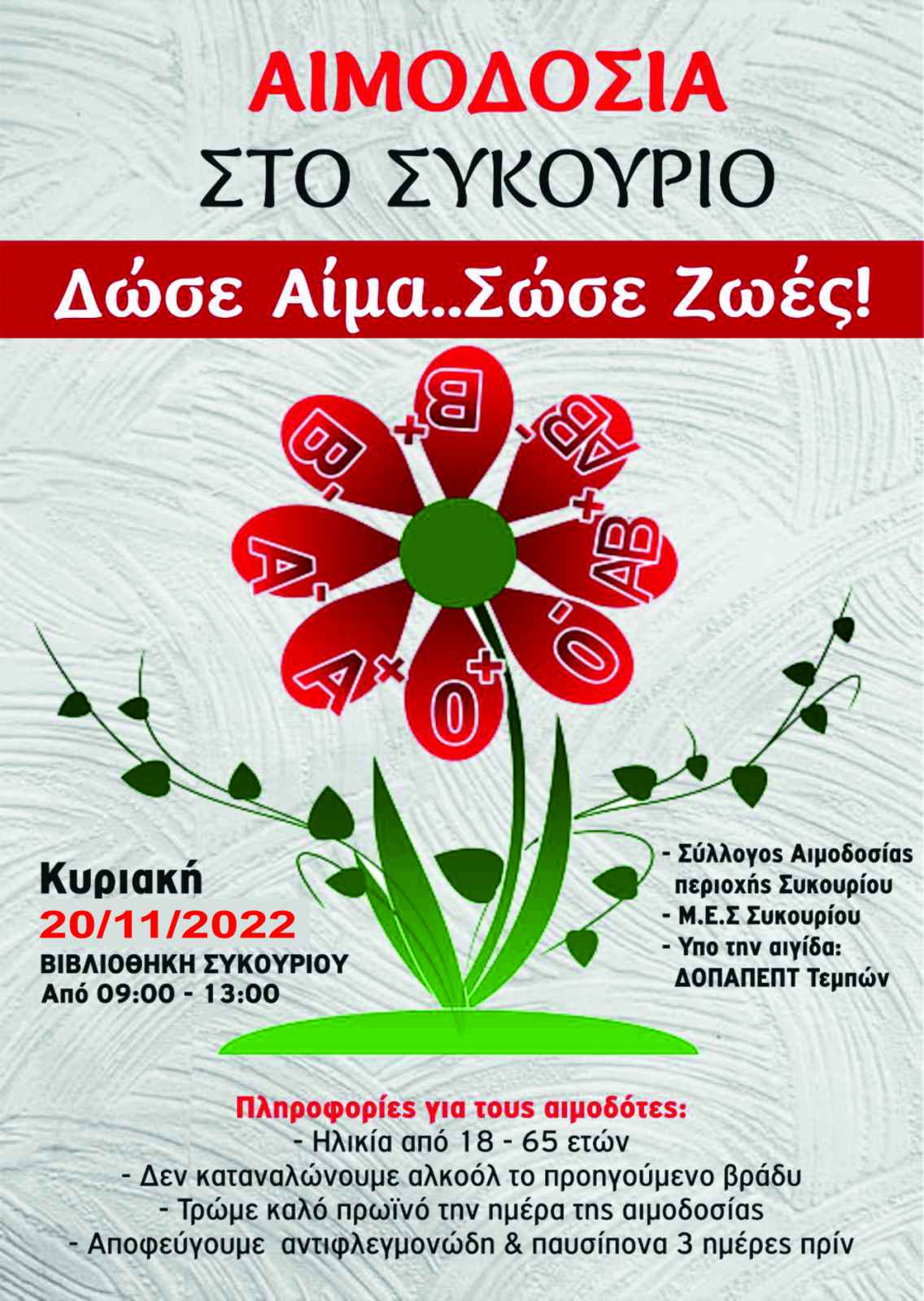Ο Σύλλογος Αιμοδοσίας περιοχής Συκουρίου και ο Μορφωτικός Εκπολιτιστικός Σύλλογος Συκουρίου, υπό την αιγίδα του ΔΟ.ΠΑ.Π.Ε.Π. Τεμπών, συνδιοργανώνουν την Κυριακή 20/11 αιμοδοσία στο Συκούριο. Η Αιμοδοσία θα πραγματοποιηθεί την Κυριακή 20 Νοεμβρίου 2022 στη βιβλιοθήκη Συκουρίου από 09:00 π.μ. έως 13:00 μ.μ. Στην Αιμοδοσία μπορούν να συμμετέχουν όλοι οι πολίτες του Δήμου Τεμπών, ηλικίας από […]