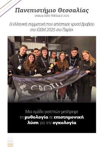 Πανεπιστήµιο Θεσσαλίας OMA∆Α IGEM THESSALY 2025 Η ελληνική συµµετοχή που απέσπασε χρυσό βραβείο στο iGEM 2025 στο Παρίσι Μια οµάδα φοιτητών µετέτρεψε τη µυθολογία σε επιστηµονική λύση για την ογκολογία 68 ΠΡΟΣΩΠΑ